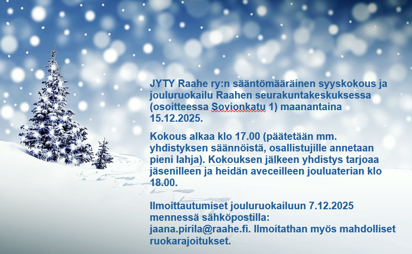 Jyty Raahe ry:n sääntömääräinen syyskokous ja jouluruokailu Raahen seurakuntakeskuksessa (osoitteessa Sovionkatu 1) maanantaina 15.12.2025.